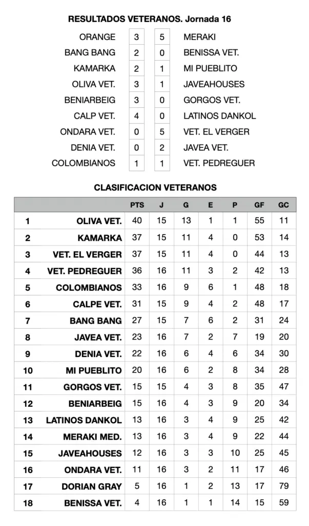 La decimosexta jornada de la Liga Veteranos de la Marina Alta, organizada por ACYDMA, dejó un nuevo triunfo del Oliva, que se impuso por 3-1 al Javeahouses, reforzando así su liderato con 40 puntos. Le siguen, con 37 puntos, el Kamarka y el Verger, los dos únicos equipos que permanecen invictos hasta el momento y que no tuvieron problemas para imponerse a sus respectivos rivales.
