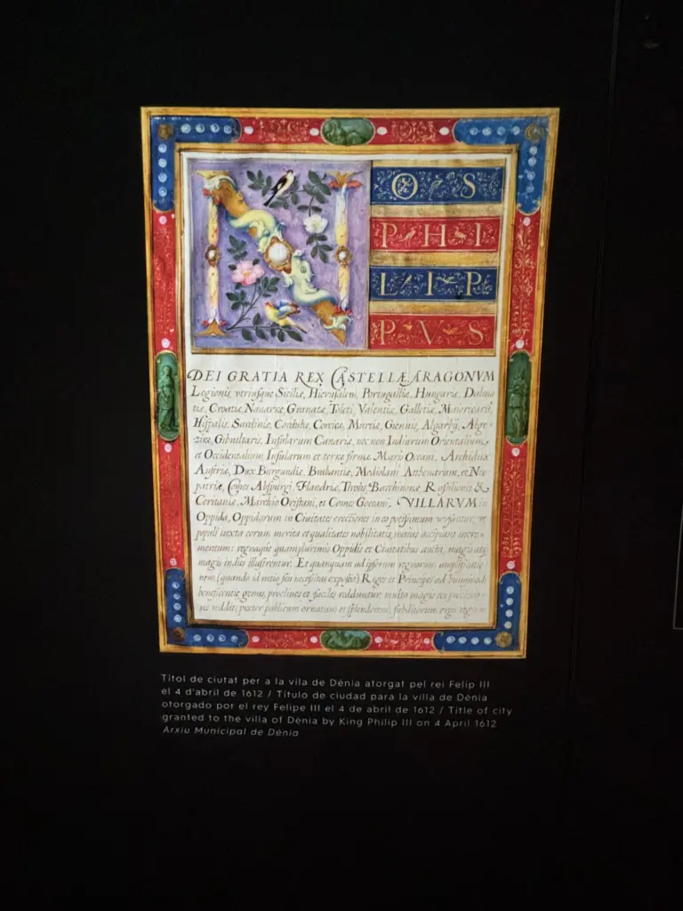 El títol de ciutat atorgat en 1612 per Felip III acompanya el conegut quadre de l’expulsió dels moriscos de Vicent Mestre, de la Fundació Bancaixa, que ha sigut cedit també per a l’exposició. Peces totes elles que ens parlen d’una Dénia que ha fet vi, sabia i il·lustrada, poderosa, de fortes creences, oberta al mar, amb vocació comercial, que es va bolcar en la producció de pansa i que ha tingut una important indústria joguetera.