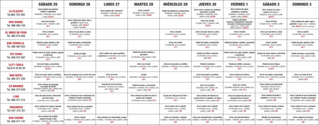 Tots ells han facilitat els menús que han previst per a cadascuna de les jornades que abasten el 26 d’abril al 3 de maig, en els que alternen els plats tradicionals amb altres d’innovació culinària elaborats amb ingredients de proximitat. Menús amb els que la Regidoria de Promoció Econòmica-CREAMA ha configurat una graella de cara a les reserves de la clientela y poder atendre-la amb la pertinent previsió, que queda publicada tant en els mitjans de comunicació com en les xarxes socials de l’Ajuntament i el Consorci de Reactivació Econòmica de la Marina Alta.