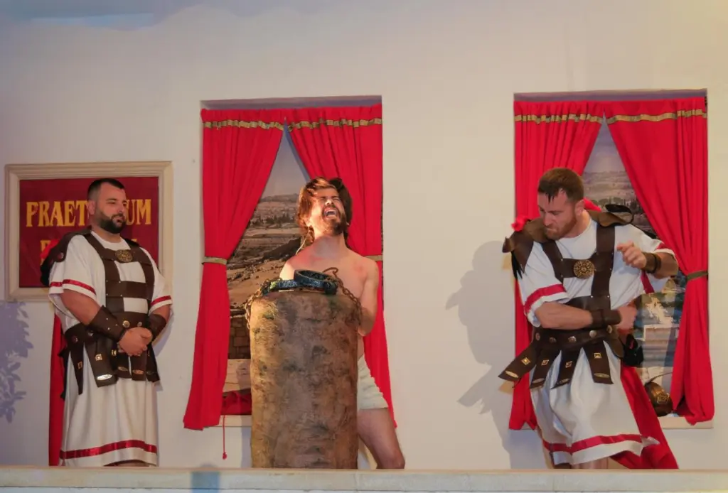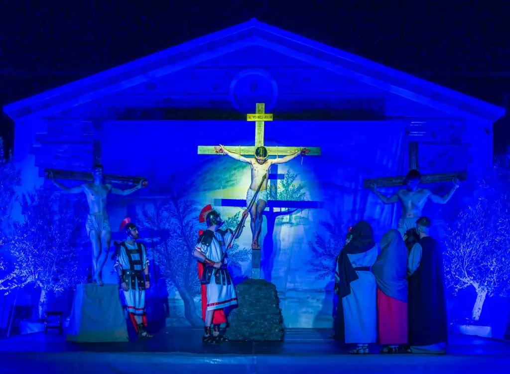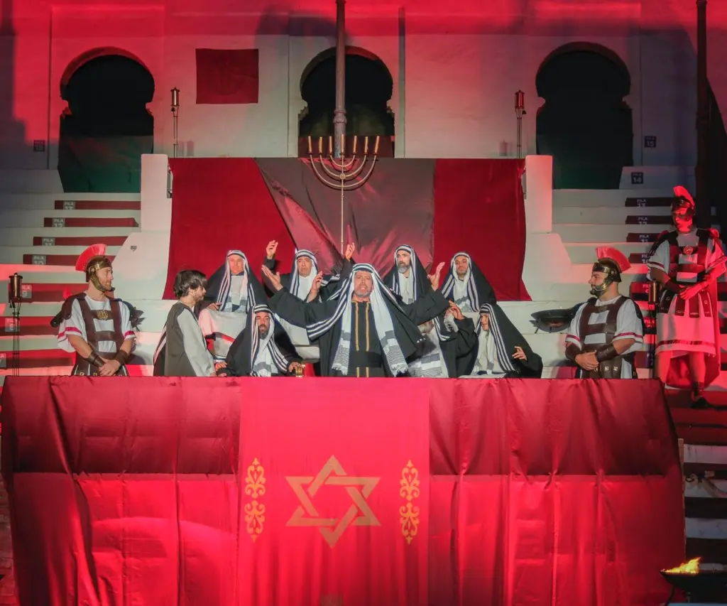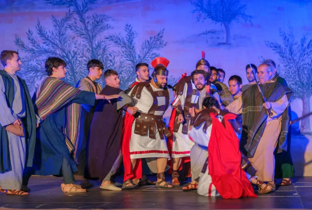 Amb un vestuari d’època que ha revestit de la solemnitat que requereix l’escenificació, la comitiva ha anat traslladant-se progressivament pels atrezzos emplaça en moll del Prado, a l’interior de l’amfiteatre taurí, a la placeta de les escoles i la plaça Major per a donar-li eixa autenticitat del l’ idioma autòcton a un relat configurat al voltant d’estacions com l’oració en l’hort de les oliveres, la compareixença davant del Sanedrí, el judici davant de Pilat, i la conducció davant d’Herodes, per a retornar a la inversa per a evocar la condemna a mort de Jesucrist, i la crucifixió.