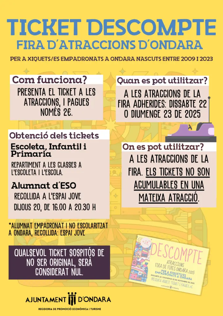 No obstant això, des del departament de Joventut han advertit que els tiquets a utilitzar tant dissabte com diumenge no són acumulables en una mateixa atracció; s’han d’utilitzar en diferents atraccions, i qualsevol sospitós de no ser original, serà considerat nul i no es podrà utilitzar. Així mateix han informat que els tiquets per a l’alumnat d’infantil i primària es repartiran als respectius centres educatius -Escoleta, Marjals i Sanchis Guarner-, mentre els que cursen des de 1er d’ESO i fins als nascuts al 2009, hauran de recollir els tiquets hui dijous a l’Espai Jove des de les 16 fins les 20:30 hores. Horari de recollida que es el mateix per a aquells xiquets empadronats a Ondara, però que no cursen els cicles d’infantil i primària als centres educatius del municipi.