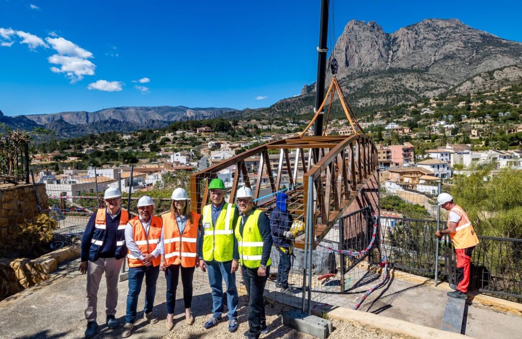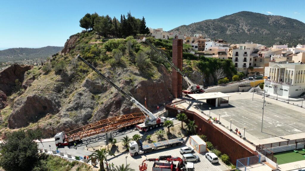 Dues grues de gran tonatge han hissat i instal·lat esta setmana la passarel·la que connecta l’ascensor amb el Castell de Finestrat, en una operació tècnica d’alta precisió. L’estructura, de 27 metres de longitud, 3,20 metres d’amplària i 12 tones de pes, ha sigut col·locada a 26 metres d’altura en una sola peça.