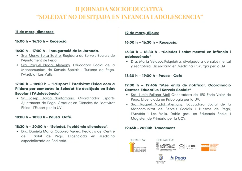 El fenomen de la soledat no desitjada en la infància i l’adolescència ha sigut abordada per la Mancomunitat de  Serveis Socials de Pego i les Valls amb la segona edició d’unes jornades socioeducatives sobre la matèria a celebrar el 11 i 12 de març de 2026.