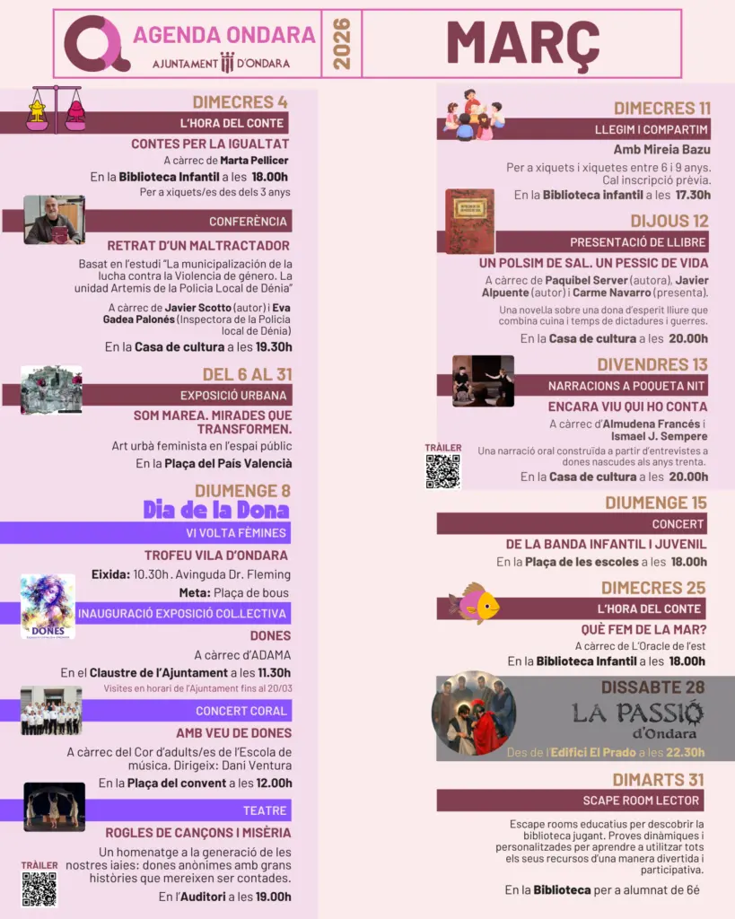 Tant una com l’altra han convidat a tota la ciutadania a participar en una agenda que abasta activitats durant tot el mes entrant pel fet que, al seu entendre, “la iniciativa reforça el compromís de l’Ajuntament d’Ondara amb la igualtat, la sensibilització, la cultura i la visibilització del paper de les dones”.