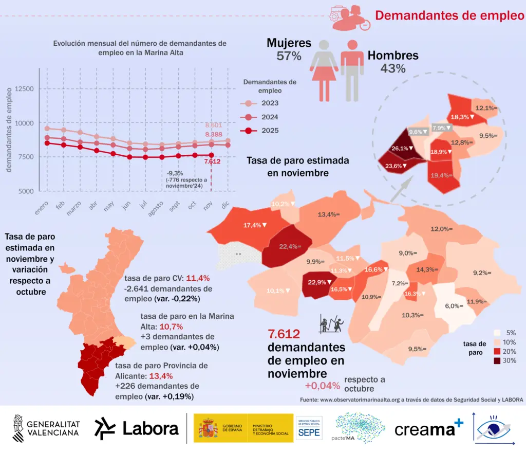 Segons les dades del *Observatori Marina Alta de *CREAMA i PACTI’DT. -projecte subvencionat per *LABORA Servici Valencià d’Ocupació i Formació i pel Ministeri de Treball i Economia Social, dins del programa AVALEM *TERRITORI de la Generalitat Valenciana-, La Marina Alta continua amb una taxa de desocupació estable, situant-se en una taxa estimada d’atur del 10,69%, una xifra menor que al novembre de 2024 (11,98%), i més baixa que la província d’Alacant i Comunitat Valenciana.