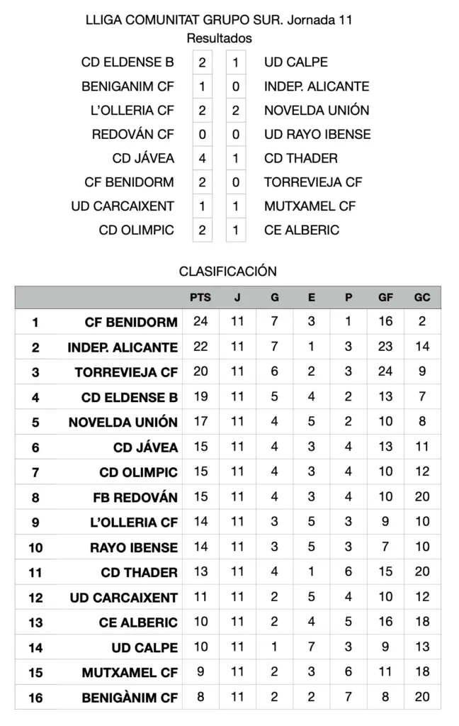 L’onzena jornada del Grup Sud de la Comunitat Valenciana va deixar un triomf per al CD Jávea, que trenca una mala ratxa de resultats, i una derrota per al Calp, que enfonsa un poc més el conjunt de Toni González.