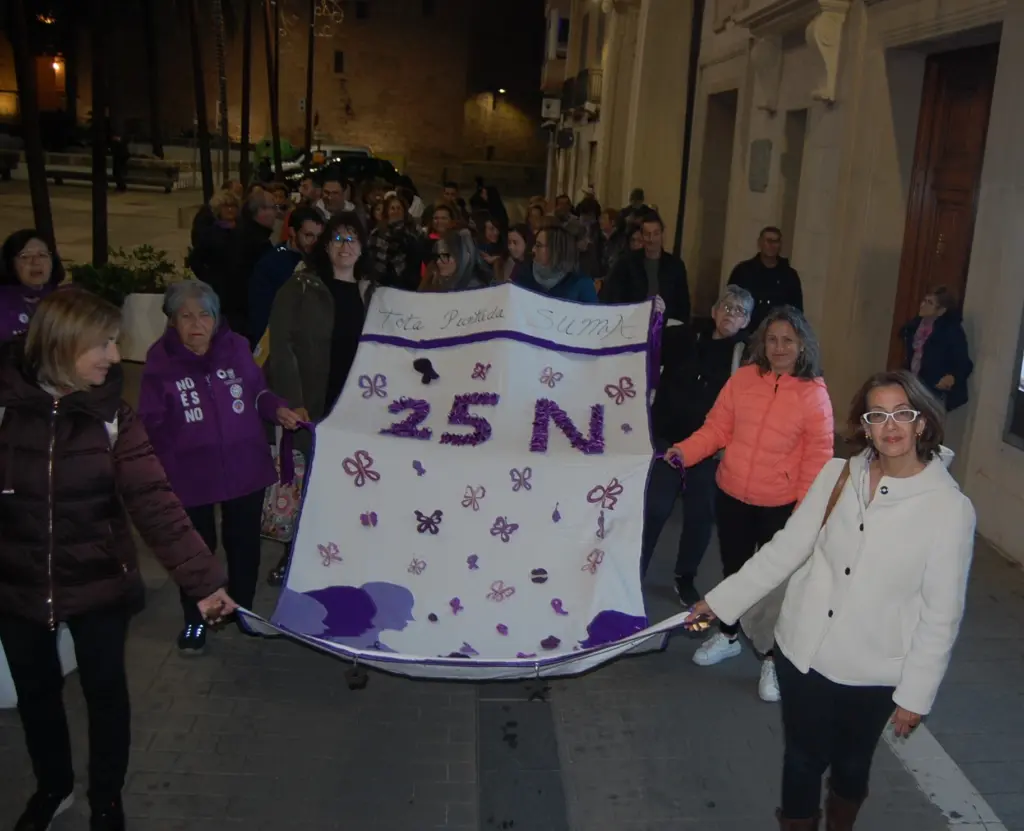 Finalment ha advertit que “som conscients que el camí serà llarg, però cada gest, cada acte de denúncia i cada acció és un pas més per acostar-nos a la societat que volem ser” abans de sumar al capítol d’agraïments a l’Aula Ueco de l’IES Enric Valor per la creació del cartell que ha anunciat la manifestació prèvia que ha recorregut els carrers del municipi i a l’Associació del ganxet i boixet per a confeccionar el tapis que ha mostrat la significació de la lluita i de la necessitat d’entrellaçar i donar se suport unes dones amb les altres.