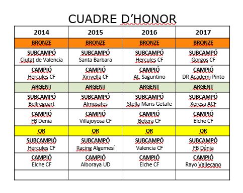 La vigésimoquinta edición del trofeo de fútbol base Ciutat de Dénia cerró este domingo con las apasionantes finales en las distintas categorías. Al final, los ganadores en la categoría Oro fueron: Elche, en Alevín 2014; Alboraya, en Alevín 2015; de nuevo Elche, en Benjamín 2016; y Rayo Vallecano, en Benjamín 2017.