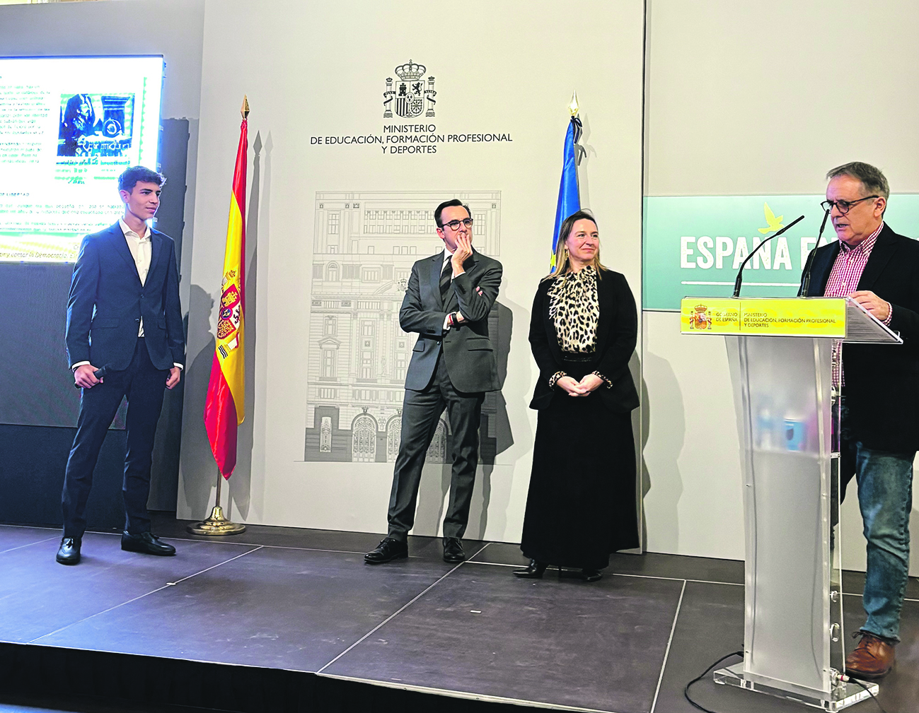 La sede del Ministerio de Educación en Madrid acogió la entrega de los premios nacionales del concurso Vivir, sentir y contar la democracia: España 50 años de libertad. Un joven de Dénia, Jon Walthon Pastor, de tan solo 16 años, fue galardonado con el primer premio en la modalidad de Investigación Histórica, en reconocimiento a un trabajo que trasciende el dato académico para adentrarse en la memoria viva.
