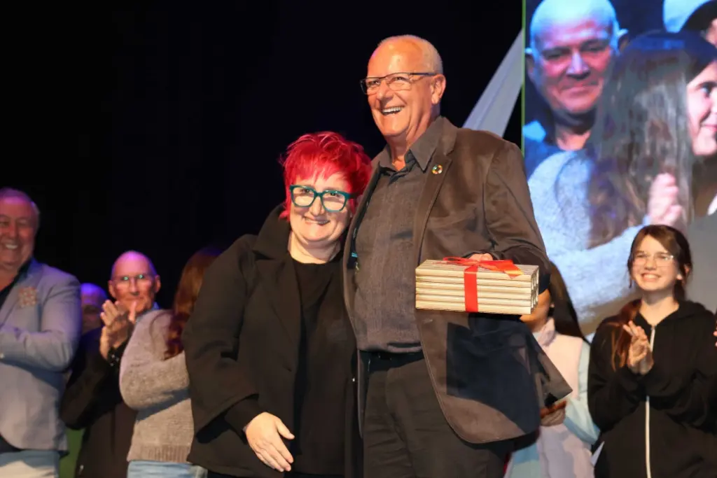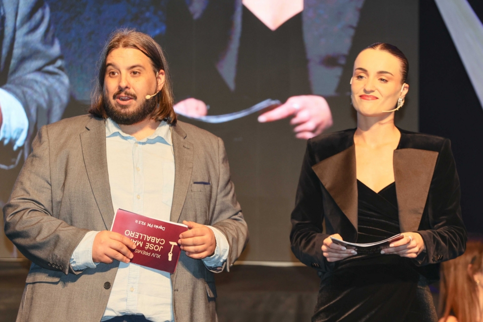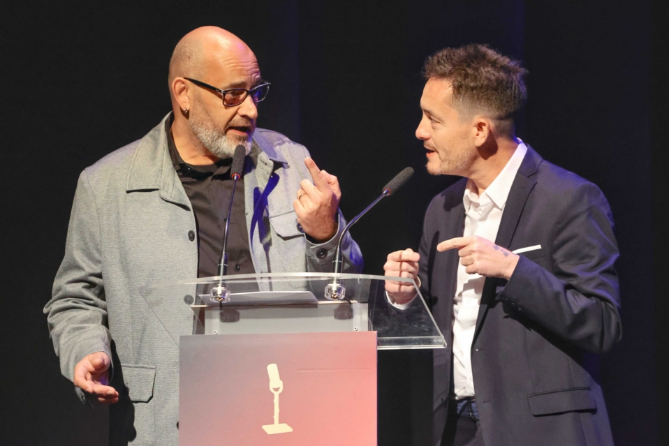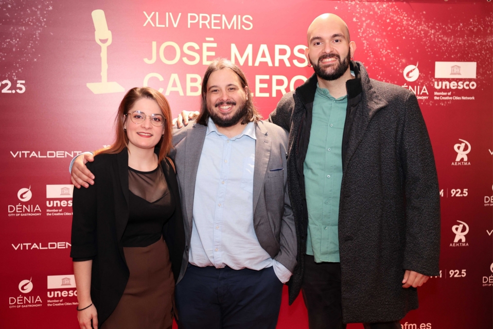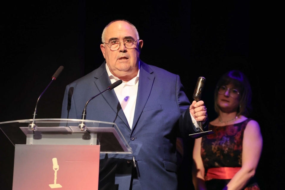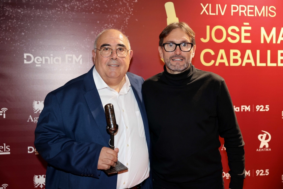 Tras esta primera parte, el gerente de Dénia FM, Jordi Monsonís, tomó la palabra para destacar la labor diaria del equipo de la emisora y la calidad de su programación. Subrayó la vigencia de la radio como un medio cercano y esencial en la vida de la comarca, especialmente en momentos clave como el apagón del 28 de abril, y recordó la contribución de Vicente Miralles al crecimiento de Dénia FM. Su intervención dio paso a uno de los momentos más humorísticos de la noche, con la presentación del falso tráiler de la película “Costablanca”, protagonizada por Vicent Grimalt, Pepa Font y Rafa Carrió.