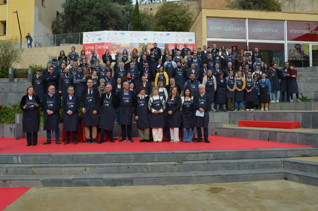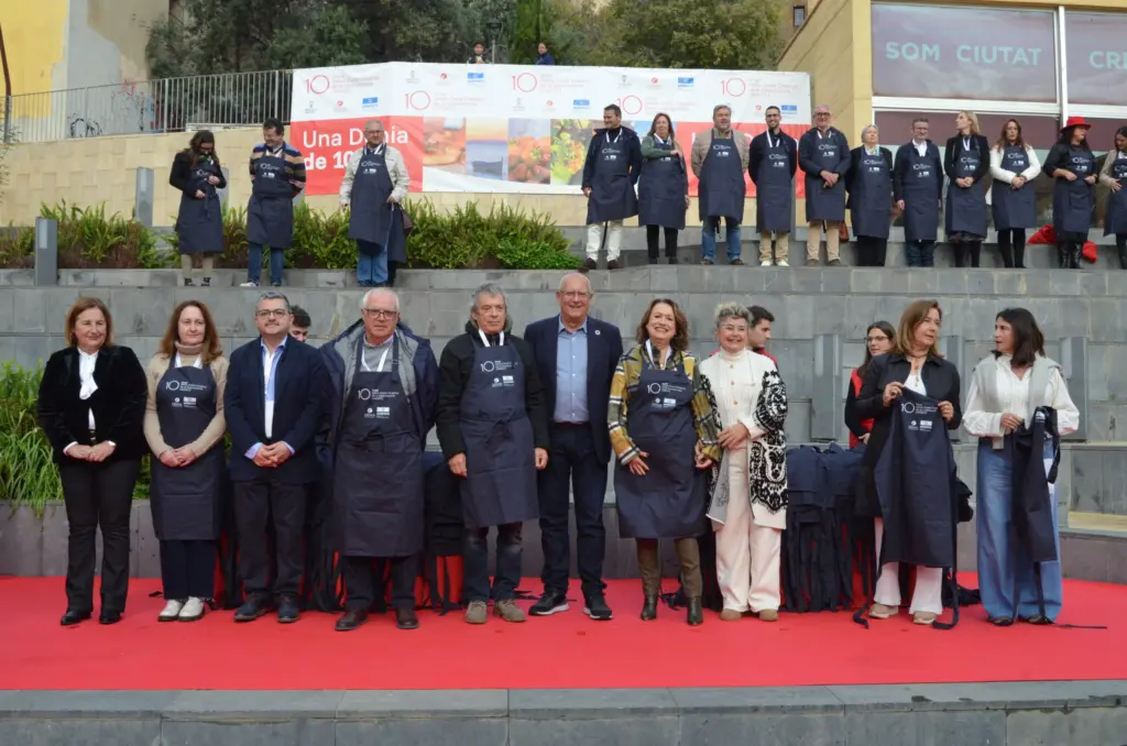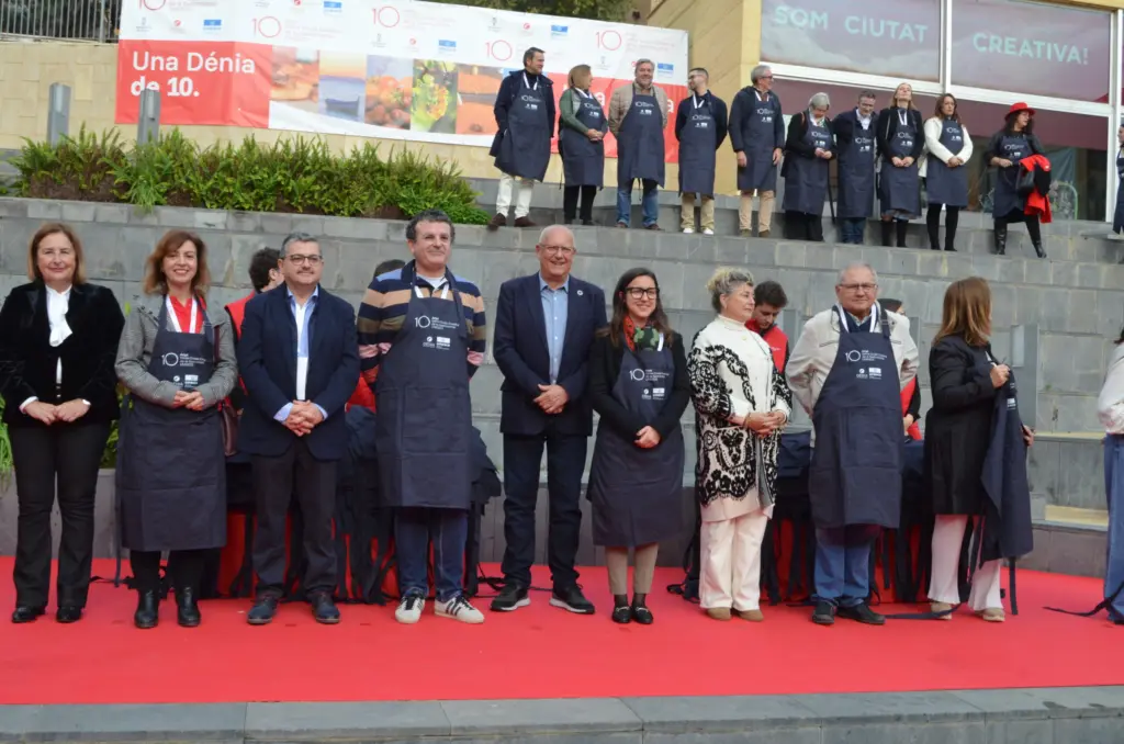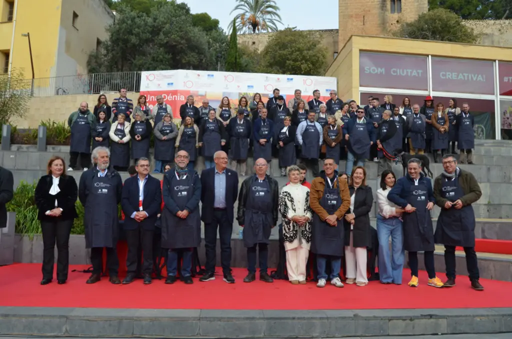 La jornada comenzó con un acto institucional en la plaza del Consell, donde se realizó la entrega de delantales conmemorativos a representantes del sector gastronómico, productores locales, entidades colaboradoras e instituciones públicas y privadas que han impulsado el proyecto Dénia Ciudad Creativa de la Gastronomía. Este gesto simbólico destacó el valor del trabajo conjunto en la última década.