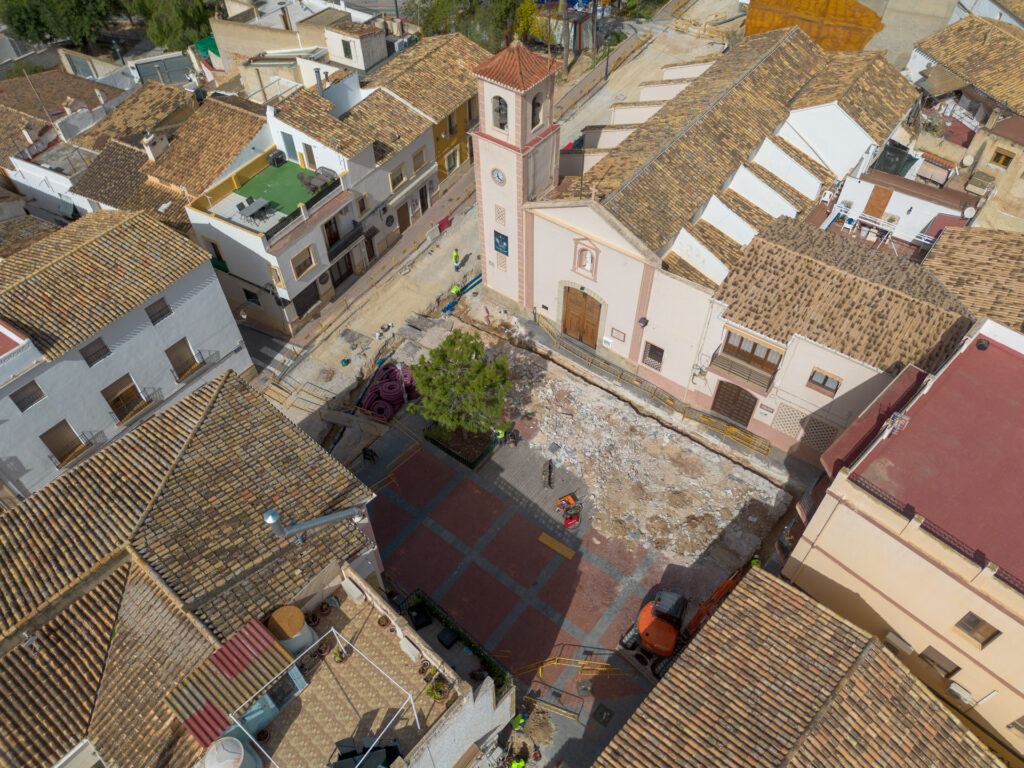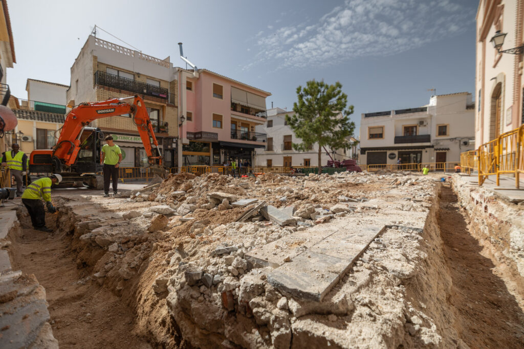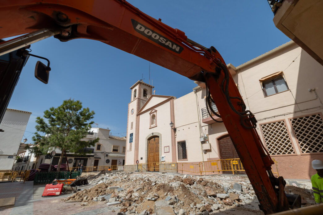 Tras actuar en un tramo de la calle Federico García Lorca, las obras se trasladan ahora a la plaza Mayor, donde se abordará una transformación integral de este enclave emblemático, que alberga la Parroquia de San José.