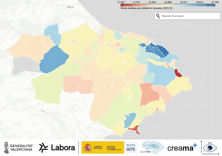 La renta de los hogares en la Marina Alta presenta notables diferencias entre municipios y secciones censales, según un nuevo mapa interactivo publicado por el Instituto Nacional de Estadística (INE), en colaboración con la Agencia Tributaria. Según el análisis que ha realizado el Observatori Marina Alta de Creama y Pacte’ma, el área de Les Rotes en Dénia es la zona con la mayor renta de toda la comarca, alcanzando una mediana anual de 21.350 €.