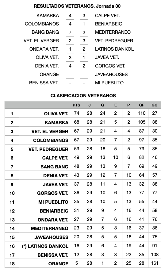 Los de la Safor no fallaron y vencieron al Jávea Veterans por 3-1, lo que les permite reafirmarse en la primera plaza. Tampoco cede en esta vigésimo novena jornada el Kamarka, que se impuso por un ajustado 4-3 al Calp Veterans. Colombianos también ganó en casa al Beniarbeig por 4-1.