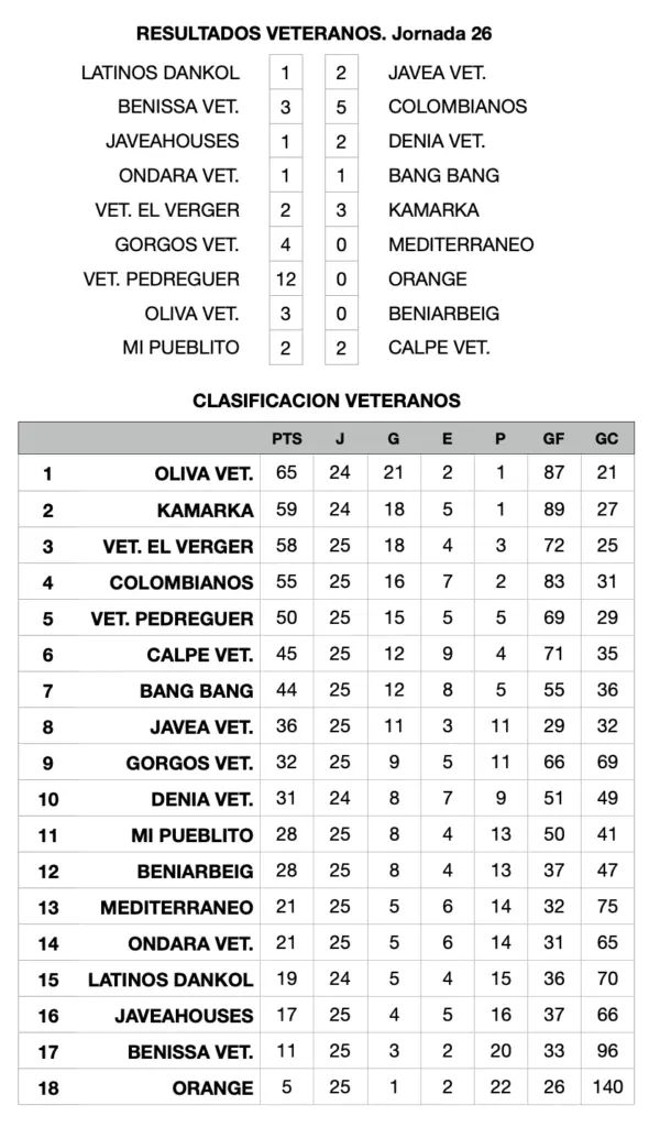 Por lo demás, Bang Bang no pasó del empate en casa del Ondara Veterans, mientras que el duelo entre Mi Pueblito y Calpe Veteranos también terminó en tablas.