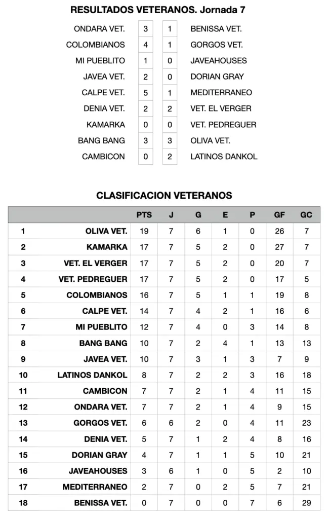 Por otro lado, Mi Pueblo y Veteranos Calp vencieron en sus respectivos duelos y tratan de acercarse a la cabeza. En cuanto a la zona baja de la clasificación, Benissa Veterans, colista, sigue sin sumar ningún punto. También perdieron Mediterráneo, Javeaouses y Dorian Gray.