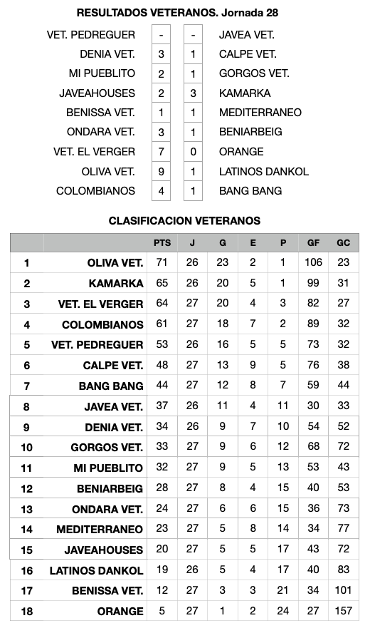 La vigésimo octava jornada de la Liga de Veteranos ha dejado pocas sorpresas. El líder, Oliva, y El Verger, otro de los favoritos, han saldado sus respectivos duelos con goleadas ante equipos de la zona baja de la clasificación. Más apuros pasó Kamarka, segundo clasificado, que venció por la mínima (2-3) en casa de Javeahouses.
