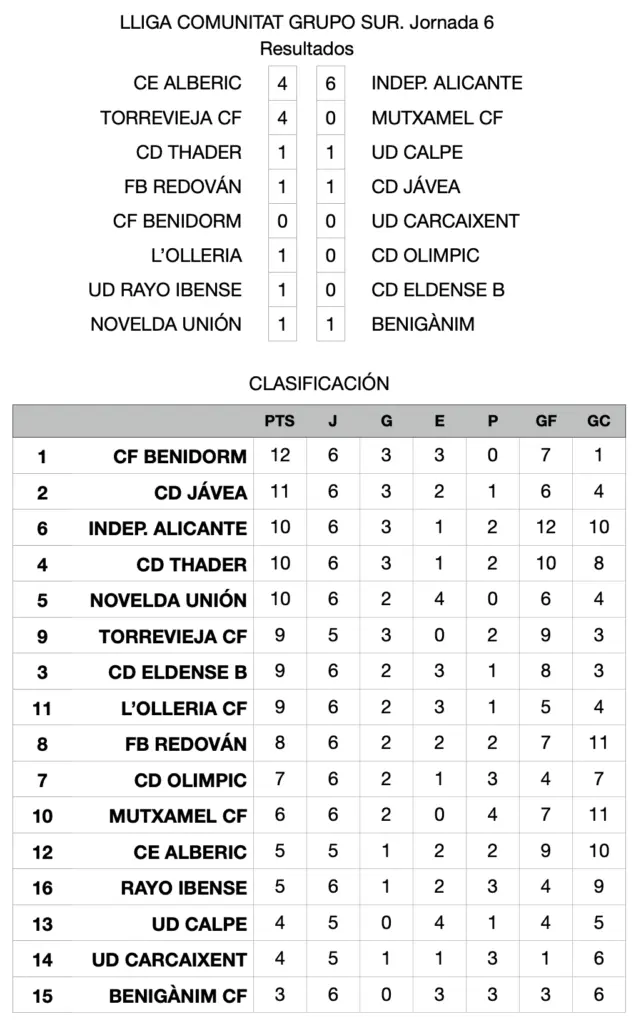 El Jávea y el Calpe cerraron sus respectivos partidos de la sexta jornada en el Grup Sud de la Lliga Comunitat con el mismo marcador: empate a un gol. El Calpe se adelantó ante el Thader en el minuto 43 con un gol de Xavi López, con el que se llegó al descanso. El conjunto de Toni González trabajó bien y supo contener el empuje del equipo local, aunque al final el Thader aprovechó un rechace para empatar.