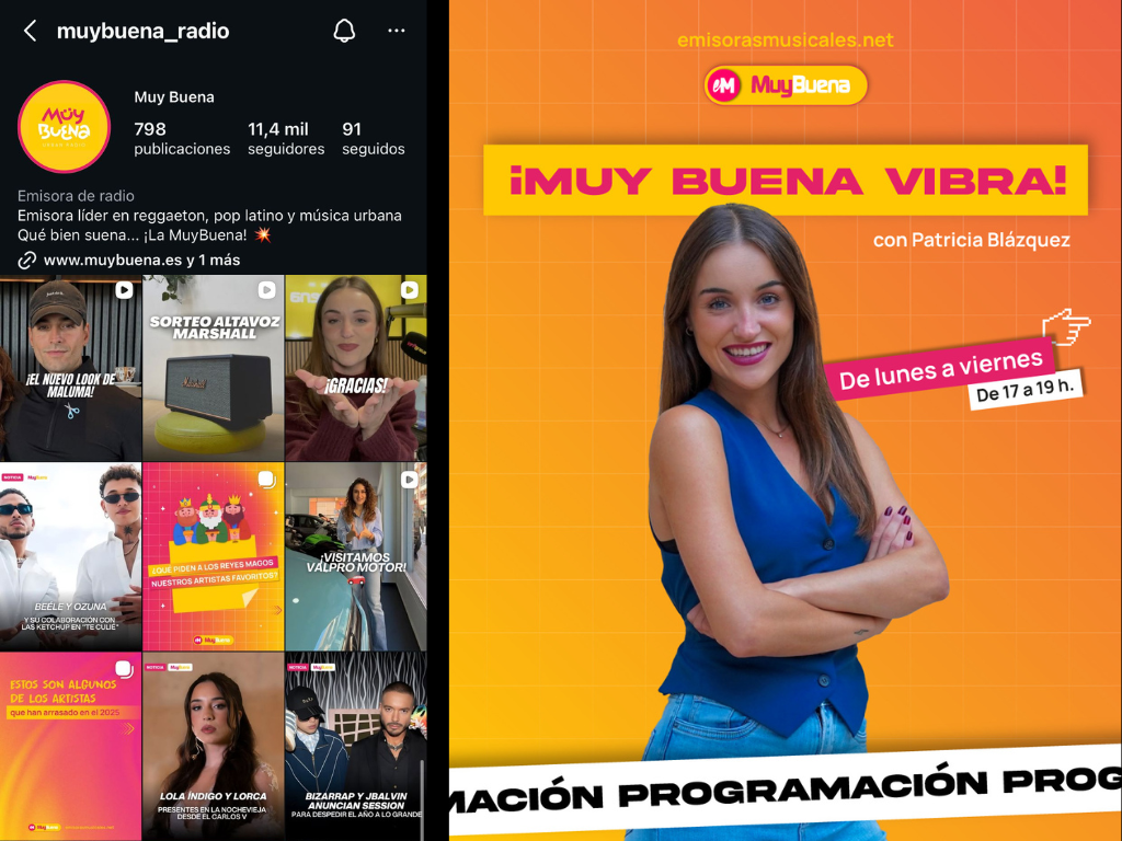 Uno de sus pilares es «MuyBuena Vibra» con Patricia Blázquez, que cada tarde de lunes a viernes (17:00-19:00h) reúne a miles de oyentes. Junto al equipo creativo de Helena González, Laura Fas y Javi Leal, ha logrado viralizar contenidos en Instagram y TikTok, amplificando el alcance de cada emisión.