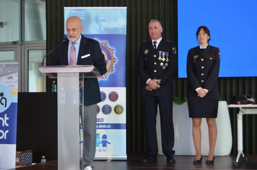 El acto de celebración del Día de la Policía Local de Dénia ha tenido lugar este jueves en L’Androna Multiespai de la estación marítima, presidido por el alcalde, Vicent Grimalt, el intendente jefe, Jovi Estruch y el concejal de Seguridad Ciudadana, Javier Scotto. En su transcurso se ha hecho entrega de la Medalla de la Policía Local de Dénia, la más alta distinción del cuerpo, a Matria Associació de Dones “por su compromiso continuado, desde 2008, en la prevención de la violencia de género, el apoyo a las víctimas y la promoción de la igualdad”.