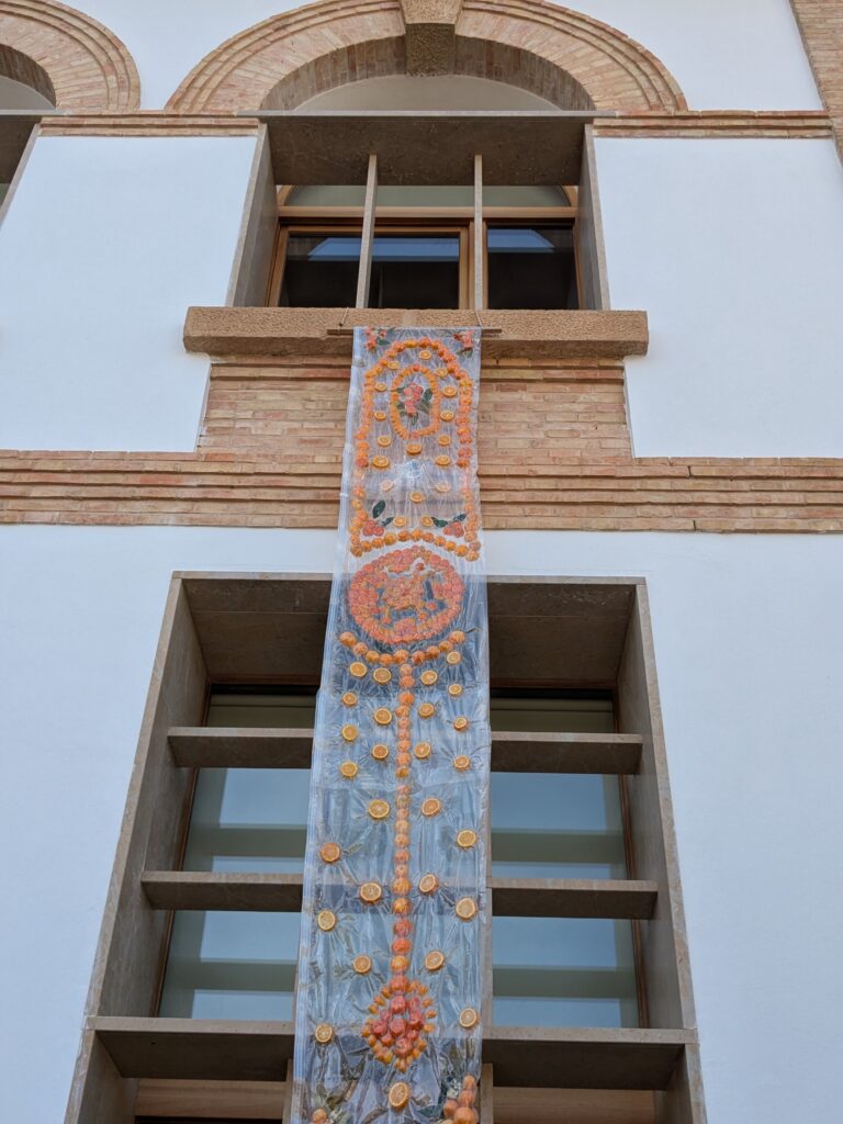 La fachada de la Biblioteca Municipal Carmen Alemany Bay ha servido de lienzo para la singular intervención plástica a base de naranjas protagonizada por el artista Salva Mascarell, con el objetivo de interrelacionar los orígenes del Certamen de Pintura Contemporánea Vila de Pego con la actual crisis de la citricultura valenciana.