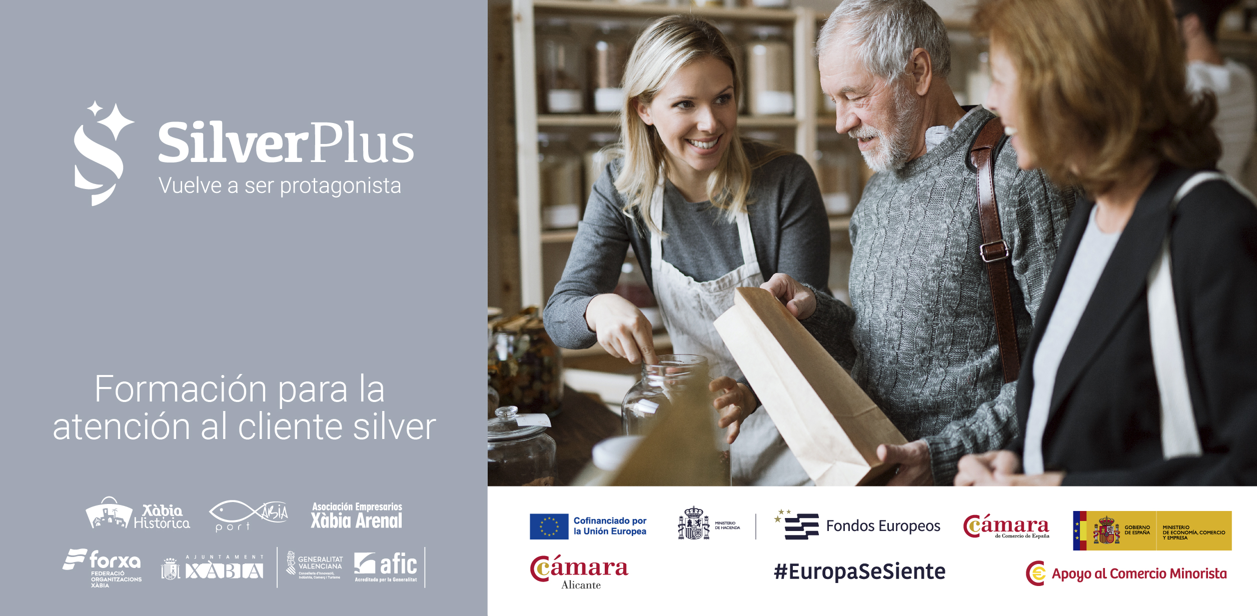 El proyecto Silver Plus se enmarca en el Programa de Apoyo al Comercio Minorista de la Cámara de Comercio de Alicante, cofinanciado por la Unión Europea, el Ministerio de Economía y Hacienda y la Cámara de Comercio de España. Su finalidad es reforzar la competitividad del comercio local, impulsar la innovación en la atención al cliente y promover un modelo de proximidad más inclusivo y orientado a las personas.
